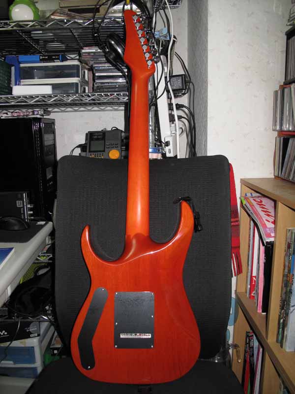 Body Top : ハードメイプル 10mm Body back: ホンジュラスマホガニー 35mm neck : ハードメイプル / セットネック Fingerboard :ホンジュラスローズ / Dumlop 6100 / 24F / 400R Machinehead : Gotoh SG360MG bridge : Gotoh 510 Pickup: (F)Dimarzio [Liqui Fire 7] (R)Dimarzio [Crunch Lab 7] Weight: 4.0kg こうして手に入れた初7弦ですが、 しかし反面、バランスが良すぎて秀でた特徴が無かったりします・・・「素晴らしいけど、優等生過ぎて味気ない」という感想も持てたり、音に変な癖が殆ど無い為逆にそれがつまらなかったりするのです。これは前回作ったギターがAllソフトメイプルBodyで癖がありすぎるギターだった為にそう感じるかもしれません。 あと7弦の音自体に関しては・・・超格好良いです。なんでかつて皆が七弦ギターに走ったのがその理由が直ぐに分かります。このLowBのタイトかつ重厚な響きは格別すぎる、本当に衝撃ですよ。 ■ネックは弾くくこと自体は意外と普通に弾け、指運はすんなり行えるので 「7弦って意外にスムーズに移項できる物なんだなぁ」と吃驚だったり。 しかし弾き続けると・・・かなり疲れます(苦笑)1弦と7弦では手首の位置がかなり変えるはめになるのでその運動で疲労貯まりますね。 あと、弦の位置の感覚はやっぱり狂います、僕の場合は特に5弦。 あと指板のホンジュラスローズについては、ブラジリアンローズウッドがもう入手困難なので今回ホンジュラスローズですが・・・案の定違いは・・・ブラジリアンより少しアタック感薄いかも?程度です。たぶんフラシーボ的感想。僕は指板の音を明確に聞き分けられる耳はないw・・・エボニーなら明らかに分かるんですけどね。 ■ピックアップ これが七弦の大きな問題点です。基本七弦ギターのピックアップは分離よくする為に中音削ってるのが多いらしいです。あとラウド系意識してハイパワーな物ばかりだったり・・・なので普通の音を作るのに苦労をするのかも(汗) ・・・これ自体は話し出すと文章長すぎるので要約すると [Clunch Lab] =パワフルなギターリフとクリーンでのコードでは分離度・音の先のコンプレッション効果は抜群。メーカーの宣伝文句通り「ビックでタイト、リッチな響き有り」です。しかし単音弾きだと中音域の無さから音の線が細く感じる。→この点に関してはFrontピックアップとmixにすると中音域が補われて問題解決。 という具合に結果は納得できた次第。 ・・・しかし、もしも普通のギターの音求めてたらやっぱり中音の足り無さでアウトだったかもしれません、少なくとも僕はリアだけの場合CrunchLabの単音は好きじゃない(苦笑) ええっピックアップだけはホント手に入れた後に再考しまくりました。しかしラインナップ見渡し再考した上で出た答えは「CrunchLabは妥協点としてふさわしい」って感じなのですw。・・・七弦用ピックアップホントみんな極端なんですよ。なんせ出だしがスティーブ・ヴァイから始まってますからね。唯一普通っぽい のがPAFですが、PAFだと今度は出力低いから・・・PAF高出力Verがあればよかったのにと思います。とにかく七弦ピックアップ選びは難しい(汗) あと今回はミニスイッチでタップ機能追加しました。TAP時は少しすっきりした音になるので効果有りですけど、両方とも音色が大きく変わることはありませんでした。シングルぽさまではいかないですね、でも使える音です。 ■総評 自分としては欲しいサウンドが手に入りましたので大満足しております。 しかしもしもDreamtheater的なピックアップの音が欲しくなかったときは・・・七弦のピックアップ選びは選択肢が少ないのでなかなか人に勧め辛いかなぁ思ったり。ギター自体は7弦LowBの音が格好良すぎて人に布教したいですがw、ハードウェアの選択肢が少ないのが難しいところです、複数本持つものでは無いと感じますね・・・少なくとも僕はこれ一本でOKです(2本目買う金ないしw) PR この記事にコメントする