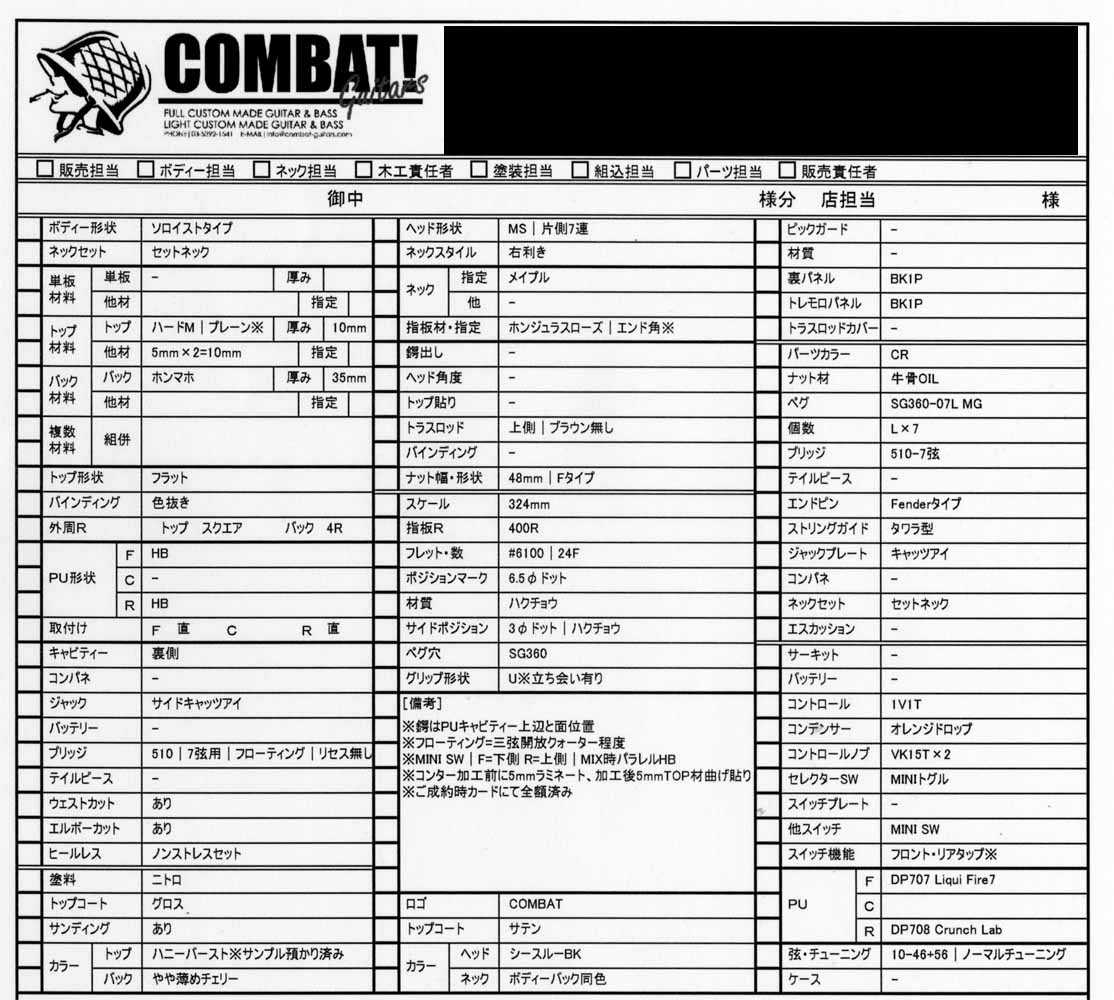 それは高校生の時ドリームシアターののライブを見て以来 ずっと憧れてきたわけですが…それから約十数年たった今 遂に手に入れました。 [Combat Guitars / フルオーダー7弦ギター] …こっそり二本目のフルオーダーしてました、オーダーより4ヶ月たった今ゲットした次第です。貧乏人なので分割払いで頑張ってます(汗) 過去何度か試奏しつつも値段と敷居の高さで未購入だった7弦ギターですが ドリームシアターが出した2011年のアルバム[a dramatic turn of events]の収録されてるOutcryの7弦フレーズに感動を覚えて以来、入手計画をあれこれ練ってた次第でした。 昔から[The Mirror ~ Lie ] [a change of Seasons]と弾きたい7弦ギターの曲はありましたがOutcryのオープニングのリフは本当にストライク、僕に取って2011年ベストリフであり、七弦購入欲が再発した次第であります。 最初は全メーカーのカタログをチェックしまして今年の四月になると丁度ドリームシアター来日も手伝って、市販品であればMusicman製ペトルーシモデル、もしくはコンバットにホンマホ・ハードメイプルBody仕様でオーダーするべきかと二択にまで絞っていました。・・・普通ファンならMusicman一択とお思いになるでしょうが・・・ミュージックマンのペトルーシモデル高すぎるんですよ。あれ40万前後ですよ!!フルオーダー出来る金額なんですよ(汗) 特価品でJPX7は三十万円きりましたが、あれの中がチェンバーボディーなので却下(音のタイトさを求めたかったので) で、そう悩んでるところ 「今なら終息品のGOTOH製7弦トレモロが手に入る。ホンジュラスマホガニーも確保可能」 とコンバットギターズからの返答有り、7弦トレモロの市販品は本当に数少ないので「また…今しかないタイミングなのか」と残酷な運命の後押しでオーダーを選択しました。やっぱりハードメイプル&ホンマホ仕様のギターも欲しかった事もありますし。 (ちなみにペトルーシモデルの中の最有力候補はエボニー使用でソリッドボディー復活となったJPXI7。三十万切ってたらJPXI7買ったでしょう…が、全く値下げが起こらなかった状況。またネックが過去のモデルよりさらに薄くなったのが個人的にちょいとマイナス点で購入踏み切れませんでした。) スペック詳細はオーダーシートを拡大して見て頂けると分かりますが、基本は