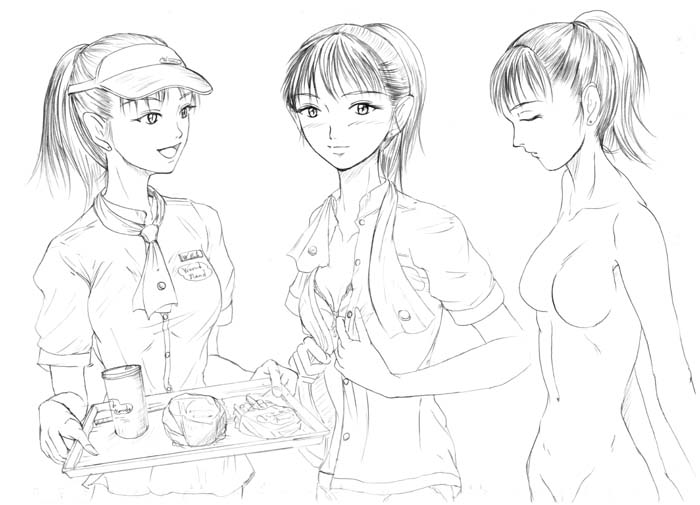 全然わからない部分が多くて (ポニーテールから前髪をどのアタリで作るかの考察) (おっさんのシワとか肉ダレ) 、練習ラフをものすごい・・・一週間描きつづけてたんですが、結局クリーンナップまで持ってきたのはこの三枚のみでした。 ・・・あっ、二枚目はラフか(汗) 最近「クリーンナップまでもっていかなくてもいいや」 と思うことも多々出るようになってしまった。 質なのか、量なのか。 ただ、ラフで有る程度芯が固まったら、「別にいいやっ」て思う方向が強くはなってきましたなぁ。 まあ、僕に必要なことはただただ描くこと、ちゃんと自問自答しながら突き詰めていくこと・・・ってには変わりないのですけど、うんむ。 PR この記事にコメントする