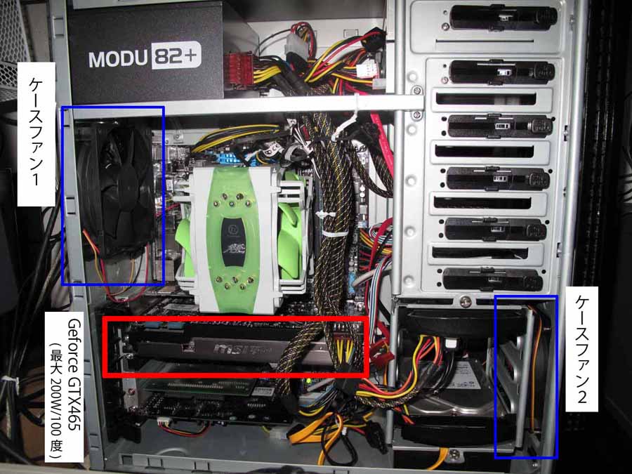 僕の方はホントは「創作&適度にビデオゲーム」の予定でしたが、 実際は 「 PCの冷却性と静音性を検証」と「部屋のレイアウト改善」 で終了してしまいました(><) ~CPUファン交換→PCの冷却性と静音性を検証」~ 前回「CPUファン交換」の記事を挙げましたが、 それによって問題が生じました。 「CPUファンの力が凄くても、ケース自体の排気が追いつかない」 最初CPUファンがケースファンより音が大きい為に風量を調べてたら気がついたのです。 僕のPCはファンに関してはずっとBIOS任せだったのですが、 実はASUSのQ-FANコントロールにより、 ケースファンの回転数=7-800回転だった事が判明。 ・・・というか、本来はCPUファンを買い替える前にまず弄るべきポイント (BIOSでファンの回転数はある程度調整できる) 7千円もするCPUファン買ったのに何という宝の持ち腐れ。 「CPUファンの真価を発揮すべく(出費の元を取るべく)、 しっかりとしたケースのエアーフローを考えよう、としたわけです。 でネックであったのが見栄だけで購入した Geforce GTX465 こいつがケース内部のエアーフローを山脈の如くぶった切ってしまってる事である。 フロントはabee市販ファンを付けてたのですが、1000回転に上げても風量はそよ風状態・・・・・・これでは全くCPUクーラーまで風の流れが連動しないのではないか? そんな訳でここからFANを買い替えたり回転数弄ったりと 半月間試行錯誤したのですが、 最終的には フロントの5インチベイを外したら全てが解決、 空気孔が出来ただけでCPUファンがストレートに吸い込んでくれるので、 CPU温度は一気に5度以上下がりました。 太い空気の流れが出来た分、グラボのファンがかき回した熱なども 排気に回ってくれてる感じです(グラボも3度位は下がりました) またファン自体も最終的には殆ど元の回転数に下げてしまう始末。 PCケース真横においてるので、リアファンで1100回転以上上げると正直耐えられない音に感じてしまうのです。 回転数は全体9-1100 CPUファン = 約1100rpm ケースファン1(Rear) /Scythe S-Flex= 約1060rpm ケースファン2(Front)/ Abee Nano = 約900rpm こんな感じでおちつきました。 自作愛好家からすれば信じられない回転数ですけど、これで温度上昇がなんとか抑えられるので、そこから先は静音性を取った次第です。 この問題に関しては 「PCの稼働音・温度を気にしてしまうか否か」であると思います。 温度なんて昔はばりばりCPU60度オーバーとかで使ってましたし、 会社のPCなんかは誇りまみれの通気性最悪な場所で稼働させているのに壊れないのを考えると、結構PCは頑張って動いてくれる物なのです。僕もCPUファンを買い替えなければ全く気にしなかった問題である(汗) なので最終的には気にしないのが一番だと思うのですが(苦笑) かと言って高熱だとパーツの寿命が縮まるのは事実だし、努力すれば静音性がアップするのも事実。 ただし、音なんてホント気になり出したら「どんな些細な音でも聞こえてき出す、液晶モニタの稼働音さえ耳障りになってしまう」と、神経質になる一方なんでしょうね。 そう言うわけで僕は半分諦めた形で終戦ですw フロントベイ開けっ放しだと埃が全開でケース内に入るので、数ヶ月後PCケース買うかもしれませんが・・・・・・そこで探したケースの値段が2万円~・・・と正気じゃない値段なので、取りあえず新ケースの事は忘れて、このまま使っていきます、(><) お金に余裕があれば ■LIAN LI(DIRAC) /PC-9FJ (19,800円) このケース買いたいんですけど、最近PCケースは高いですよね。Abeeの日本製とかWindyとかだと3万からとか・・・価格おかしすぎますって(汗)