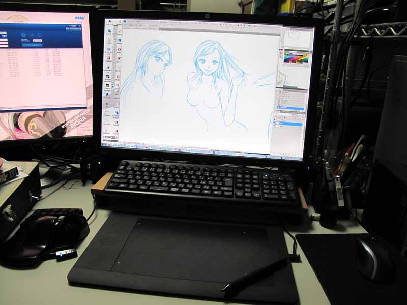 気になっていた筆圧2042レベルよりも、まず衝撃を受けるのがペン先とオーバーレイシートの摩擦抵抗です。 何しろゆっくり描いても線がよれない、ペン先に安定感がある!! これは個人的に超衝撃であります。今までつけペン並に癖のあったタブレットペンが、ボールペンライクにまで簡単に画けるアイテムに替わったわけです。 恩恵としてはとにかく書き損じが減るわけ・・・こいつはホントに凄いと。 オーバーレイシートのエリアが読み取りエリアより大きめに取られてる分、線を勢いつけて引けるのも良い点です。 あとやっぱり筆圧2042レベルも結構凄いと感じます。 で、欠点もあります 摩擦抵抗が大きい関係でペン先がガシガシ削れていきます。 過去intuos2-3でペン先を交換することなど年一回あるかどうかでしたが、このintuos5のペン先は画いてるとオーバーレイシートに擦り跡が残る次第。 私的には丁度ギターのピックと同じ程度の耐久性かなぁと、一ヶ月くらいが寿命かなぁと感じたり。 また筆圧に関してはレベル段階が幅広くなった為、消しゴムツールが逆に難しくなったり。ペン設定も塗りのレベルをオンにしてる場合は勝手が違ってきたり……とその為の対応は必要だなぁと感じたりです。 あと筐体がでかいwww・・・右側の五センチ近く削って良いと思うんですけど。 しかし個人的に一番頭を悩ませるのはセンサーが過敏すぎて、ペン先の魔改造を受け付けてくれなかったことですね。 タブレットの一番イヤな点って僕に取ってはペン軸とペン先のスキマから発生するぐらつきなんですよね。書き始めのあのブレだけがどうしてもきになって仕方がないのです。 で、intuos5のペン軸のスキマ自体はintuos3の物よりも細く作られていて、ぐらつき度が減ってるのですが・・・それでもやっぱりぐらつきはあります(感度の関係仕方ないのですけど) 僕自身はそれをメンディングテープを薄く貼って揺れがないようにしてたのですが、・・・intuos5の場合はセンサーが良すぎてずっとクリックした状態になってしまう始末でした。たぶんこれは薄いテープにしても同じ事になるかなぁという感触です。・・・まあ魔改造なんでやっていけないことなんですけど、元々w (注:奥のセンサーがテープのカスで詰まる可能性有り・危険行為です) ちなみにペングリップはボタン無しの物を取り寄せました。描いている途中のクリック誤作動もいらつく原因なので僕は取り除いてしまう派です。 総評としては、書き損じが少なくなり時間が有効に使えるので、僕的には大きな買い換えだったりします(・・・これでペン先ぶれなきゃ万々歳なんですけど)。タブレット比率自体も4:3からきちんと16:10になったのも大きい点です。ただし、最初っから用紙を挟んで線を描いてた人とかですと・・・そこはあんまり変わらないのでは?って思います。 あと肝心のオーバーレイシードの消耗度ですが・・・これ実はペン先は消耗するけどシート自体は傷ついたりしません。ペン先の素材は擦りつくけどシート自体に傷は無し。シートの耐久性はたぶんintuos2-3と同等だと思いますよ。 ・・・ってなると、かつて一度もシートを交換した事がない僕的には現行のタッチ付きでもいいんじゃないかって事になってくるわけですけどwww ・・・まあ絵は変わりませんが、時間は早くなるのでありがたいですやっぱり、はい。 あとモニターも密かにアウトレットのHP ZR2440w買いました。 今はHPのモニター1920x1200を二台並べてます。 (HPな理由は中古市場で16:10のモニターが安いから) 買い替えた一番の理由は 「右側のメインはフォトショップとコミスタメインの作業用に、左は映像とゲーム用に」と これで絵を描きながらXBOXも同時起動が出来ます!!(ダメ人間) いままで使ってたNANAO(EIZO)の21インチはリタイアです。 トリプルディスプレイも出力出来るグラボですが・・・三台は置く場所がないですよ。・・・うん、無理 PR この記事にコメントする