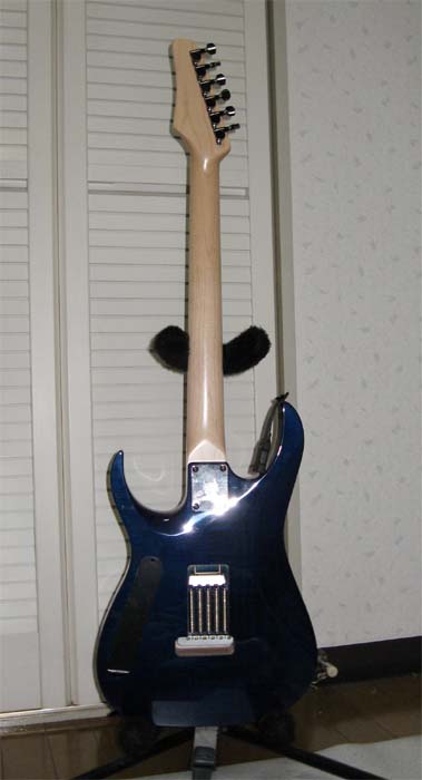 machine Head 後藤 510シリーズ body Top : キルト・メイプル 2P Back : ソフト・メイプル 2P neck ハードメイプル1P ノーマルスケール figerboard ハカランダ(ブラジリアン・ローズウッド) flet ダンロップ 24F Bridge 後藤 六点止めシンクロナイズドトレモロ (with カラハムブロック) Pick uo Front ディマジオ Air Norton Rear ディマジオ Air Norton control ボリューム1 トーン1 3-Way トグルスイッチ 詳細書いてある仕様書は部屋のどっかに埋もれてて見つかりません(^^; ネックは、持ってるIBANEZのJPM100P2(旧ペトルーシモデル:ピカソ3)のネックをコピーしてもらいました。 ヘッドデザインはコンバットギター社長本田さんのギターをまねてます。「社長のと一緒でいいです、アイディア思いつかないんで」 ・・・何しろ、オーダーするって急遽決まって、5日くらいでオーダーすることになってたので、超突貫的にデザインした次第ですから。でも、僕にとってはボティー若干コンパクトなのが大人気があって気に入ってます。 フィンガーボードも実は超値の張るブラジリアンローズウッド・・・ワシントン条約にひっかかる木材なので、かなりの稀少材。でも同じローズウッドでもさらに暖かみある感じなんですよねぇ。ブラジリアンローズは。 コントロール部の位置はピカソ3と一緒。 ピックアップは両方ともエアーノートン。ディマジオのエアーバッカーシリーズで一番クリアなピックアップだから。 リアノートンなんて初めてだけど中・高音かなりいいかんじですよ。トリブリーになる直前で止めた落ち着いた音で僕は好きです。 で、ブリッジはストラト系で使われるシンクロナイズドトレモロ。トレモロほとんど使わないんだけど、スプリングによる残響音がほしいのでこれです。六点止めなのは社長さんに「六点じゃないとカラハムつかない」って言われたからです。僕は二点希望でした。ジェフベックみたいなやつ。でも六点の方が理論的にも音いいですよね。 ■背面。 ・・・これが今回のサウンド面目玉となる バック材にソフトメイプル!! 市販品でソフトメイプルをバック材で採用することはほとんどありません 理由は・・・高い材だけどフラットすぎて特徴ないから、率先して使われることがまずないんですよね。 しかもソフトメイプルは木目がでるから通常TOP材5ミリの化粧板なんですよ・・・40ミリっていったら化粧板8本分つくれますもんね(汗) でもやっぱり音質的に上品だけど「上品だねー」で終わりそうな木材だからだと思います・・・マホガニーとかアッシュとかと違って、楽器屋だと埋もれがちになるかもしれませんね。 かといって音質最高といわれるハードメイプルは・・・重すぎてジョージ=リンチ以外引けそうにないですし(苦笑) で、結果ソフトメイプルバックですが・・・ シオ的にはこれがすばらしい!!! 音質のバランスよくて、なおかつ音に厚みもあって 特に低音の濁りのないところが最高です!! これはコンバットに作ってもらったと言うことと、実は弦が11-52の極太設定ってこともあるかもしれませんが(^^) とにかく今回サウンド面の望みは 「ピカソ3の不満点をすべて改善したギター」 だったので超大満足な仕上がりです。 ちなみに木目の方は、最初「木目ないプレーンでお願いします・・・木目あると値段張るから」と依頼してたのですが、ネック預けにいったとき 社長「いまさぁー良いプレーンのメイプル全然入らないからさあ!!」 となんとフレイムかかってる木材を選ばせていただいた次第。 バックは濃い色だからわかりづらいけどね、・・・誰にも見えないし(笑) でも超高い木材にしてくれて、ちょっと優越感感じちゃいます。 ・・・ブリッジの根本についてる金属ブロック「カラハム」 は実は未だによくわかってない。社長曰く「密度がよくて、音がすばらしくなる(サステイン系)」 とのことで、言われたまま付けた次第です。 結果、音いいっすよー。上品にのびてくれます。 とりあえずどんなギターなの?と聞かれれば 超上品な音を奏でるギターです。 それは、ギブソンやグレッチのエレアコ等を指すのではなく。 音が暴れすぎず、上品にのびてくれるというサウンドです。 メイプルボディーなのでアタックの感度は抜群 かといってアッシュ・アルダーの様な尖り・癖があるわけでもない そこがsioにとっては重要なんですよ。 あとチューニングしやすいことが非常にw ここポイントですよホント。 フロイトローズ系はもう僕的には地獄でスモン。 弦とスプリングの張力をバランスとってユニットを平行にさせる・・・・・・・正直大変なんですよこれって(苦笑) 個人的にはここまでの仕上がりには大満足です。 選択しもぎりぎりの範囲で考えて・・・すべてうまくいったので、最高です。 こっから先の望むスペックとすると 「ボディー材:ハードメイプル」 ・・・音は良いでしょうが、重すぎて持てません(汗) 「フィンガーボードもメイプル」 ・・・そうすればオール・メイプルだけど・・・僕はローズウッ