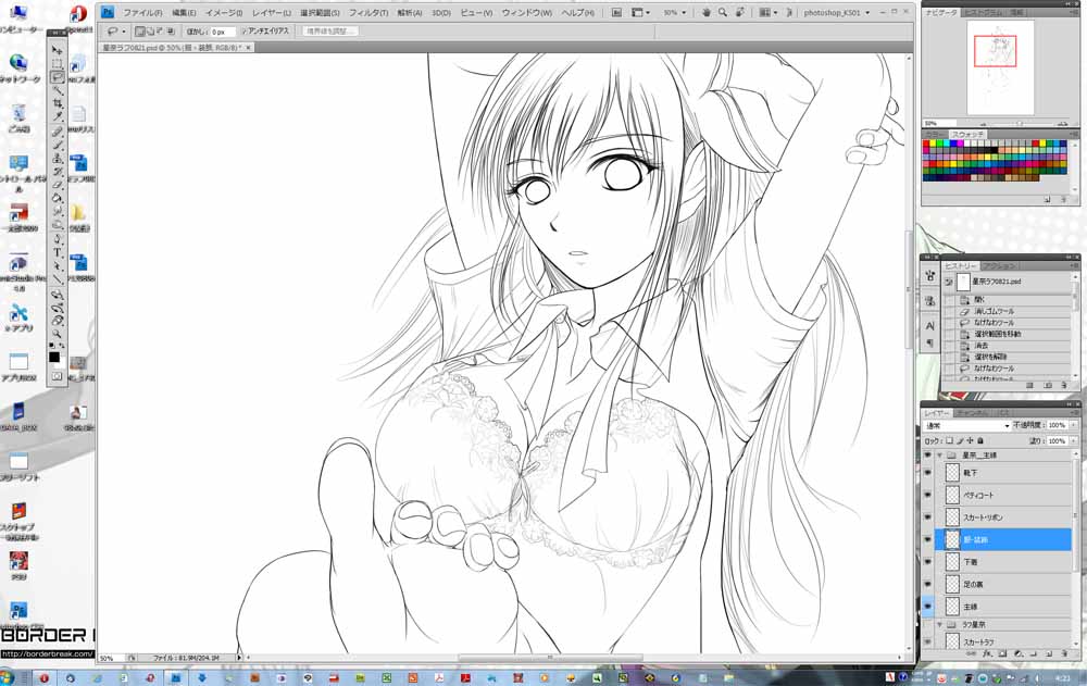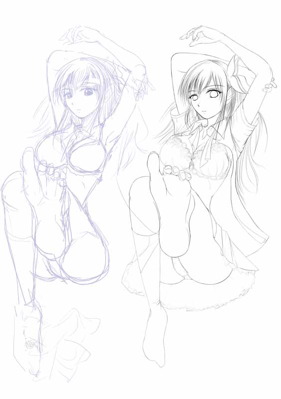 との疑問に対し、一枚フルデジタルで絵を仕上げようと試み中です。 取りあえず今回ソフトはPhotoshopオンリーで始めました。 結果今日線画終了で線画のみで一週間費やす(涙) ・・・話にならない(涙) コミスタのように強力な線画補正エンジンが無いと、僕はやはりタブレットで普通の線が引けない模様です。 なので全部肘使った線なので、線引くのに恐ろしく時間がかかってます。 あと今回は「きっちり誤魔化さずに描こう」をテーマに頑張ってみてます。 いざ誤魔化さないとなると、実は全てが分かってないことを痛感してます。 左のラフを元に右の線を起こすのに一週間なのです 一週間の半分はペン握ったまま頭抱えててディスプレイを睨んでるだけの自分がいました。 ・・・まあスランプで絵が描けないってのもあるかもしれないのですが、全然デッサンとかディテールが頭に入ってない証拠なのだと痛感してます。 勉強あるのみ、さてこの先は色塗りなので本当にさっぱり分からぬ状態 今日からまた買ってきたPhotoshop参考本を読んでみて一つ一つ塗り方覚えてみます(汗)
