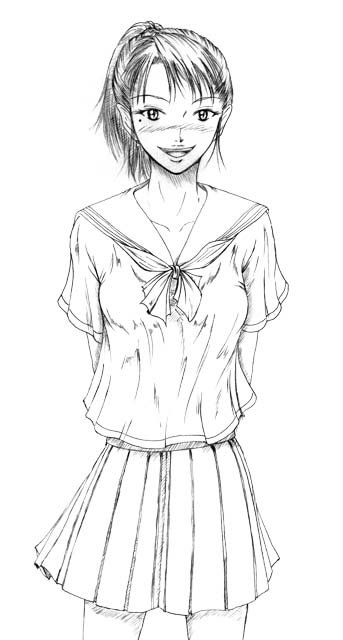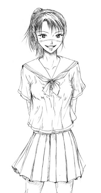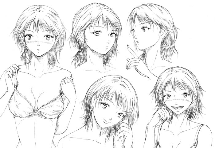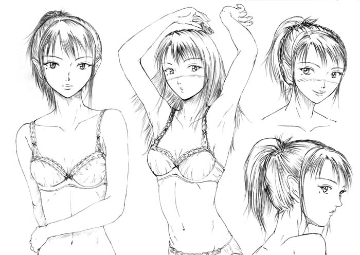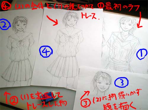 ・・・・・・というか、最近まで絵に対する「嫉妬・自信喪失」がピークに達し頭を抱えてました。2~3年に一度位「何で他人が普通に持ってる物を何一つ持ってないんだぁ!!」症候群みたいのが訪れるんですが・・・自分、即興描き・絵心を持ってない部分を承知で描いてきたのに、それに非道く落ち込む時機があったりします(汗) で、最近はラフ描けども清書に持ち込めなかったり・・・と調子来ってたのですが、 兎に角描くしかない!! 悩んで躓いてるんだったら、新しい事やって躓け!! 本当に悩まなきゃ行けない、描いて学ぶべき事いっぱいあるだろ!? と気分を一新してみる事にしました!!・・・って事で、裸絵に焦点を向ける事にしてみましたよー!! ・・・・・・描けないんですよ、オッパイが(苦笑) なのに、裸の絵ってあんま描かなかったりします。 理由のひとつは、描くのも見せるのも凄く恥ずかしいって点。・・・もう一つは真っ裸より半脱ぎが好きなフェチな点です(苦笑:だから下着絵は躊躇せず描いてます) ただ、裸で描かないと一向に「オッパイが描けない」し、色っぽい感じを覚えないかもしれないし・・・ってことで ・・・何事も挑戦ですね(^^; 出来るだけ長い期間頑張りたいです。 過去に数回チャレンジしてますが 実は10数枚程度かいて、練習戻っちゃって・・・っで、全く吸収し切れてない期間でしたから(汗) でも、ホント描く事自体苦手なんです。デッサンとか、肉質とか難しいですよコレー(涙) PR この絵アップする日付を入れて、今日が自分の誕生日だと言う事に気がつきました・・・29歳、微妙すぎる年なので全く嬉しくない・・・というか悲しいです(苦笑)就職とか厳しいんで(汗) それは置いといて。 絵を描き始めて9年という事になっちゃいます。 ずっと「描き始めが遅いから」が決まり文句だった自分も、いつの間にか9年。もう言い訳はできない年数になってきましたよ、こちらも(汗) 個人的にポジティブに感じるのは 「9年たった今でも、ひとつ描けば何か必ず発見があり、上達に繋がる」 っていうこと、限界とかそういうのは全く感じない 裏返すと 「9年間なにやってたの?」 って事でもあるんですけど(汗) 成長は遅いです、でも頑張ります。 でっ、29歳の目標は「成果を形として残す」です。 いま何となく決めましたー。あうち (1) 1番最初のラフ (2) 1をひっくり返してトレースして出来た絵(没) (3) 1のラフを元に10回位描いて出来た顔正式案 (4) 2と3をくっつけた怪しいトレース絵(完成) そうして出来た4の絵ですが、表情とかみると2の方がずっと良いだろって罠にはまりました(涙)・・・造型・雰囲気的だと4でないと使えないんですけど、なんか比べてしまうと「どうしてこんな絵に負けるんだろう」と悔しがってしまいます(苦笑) 同方向のトレースは「なぞる作業」になってしまうので苦手です。 トレース台は多用しますが、基本的には「ラフを裏返してアタリとして利用」なのです。 ですから、3の絵みたいにラフ用紙に全部きっちり描き上げてしまうと、本番の紙に描く際は非道く苦労します・・・というか、描けないです(涙) 久々に何度も何度も描き直して今ひとつだったので、その悔しさを書き留めてみましたっ ・・・くっそう!! あとはこんな風にあれこれ悪戦苦闘しても、密かにコンマ数ミリの線とかは他の人には全く同じに映ってしまう・・・意味あるの?って疑問も常に頭によぎってしまいます。そういうの適当にしてたら上手くならないのでしょうけど・・・偶に時間の無駄?と弱音を吐いてしまう事多々ありデス。 ・・・・・、だってPC上から確認したら・・・・・・描いた当人が「どっちもいっしょじゃん」と思いました(苦笑) うぎゃー、何の為に苦労したの!!