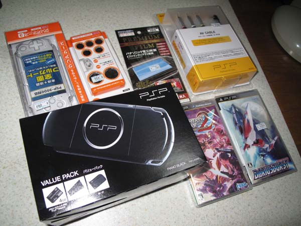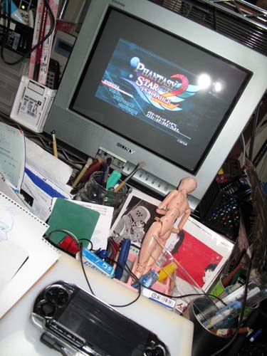 ●PSPバリューパック(本体&メモリスティック&ポーチ) ●外部出力ケーブル(コンポジット) ●液晶保護フィルム ●HORI交換パット ●HORI保護ケース ~ソフト~ ●TAITO ダライアスバースト ●SEGA ファンタシースターポータブル2 を購入した訳です、魔のカード分割マジックを利用して(苦笑) で、こんな具合になりました。 一部のアイテムは使ってません(TT)交換パッドは上からアタッチメントをシール止めするものだったのに気が付き却下。保護シールは貼った物の、クリア保護ケースにいれたら意味がないことに気が付く始末(苦笑) で、肩こり予防にTV出力をメインに考えてました。 結果はこれ ・・・解像度の関係か、TV出力でゲーム画面に切り替わると何故か小さくなるのですよ。 このTV14インチだから・・・ゲーム画面は8インチくらいなのか? それでも首の位置が下向きっぱなしになるのを防げるので肩こり予防には良い感じです。 ただ、問題は・・・チャット画面とか文字がぼやけて判断つきませんね(汗)携帯ゲームの画面引き延ばしてるのだから、あたりまえなのか?・・・TVだけでガンガンにプレイするのは難しいかも知れません。 で、ゲーム自体ですけど ダライアスバーストは一回:20分だけプレイしただけで PSPO2だけやってます。 少しでも仲間との遅れを取り戻そうと攻略本も買ったのだけど ・・・・・・攻略本はあまりの分厚さに挫折した(苦笑:800Pオーバーです) ・・・ゲームの攻略本はレイストーム以来の約十数年ぶりの購入だったのに、まさか「読む気にならない」などの結末がまっていただなんて。最近のゲームのデーターの濃さは凄いんですね、ホント。 で、PSPO2はオンラインで冒険できるのですが 僕の今のネット環境の無線は11aの為、WIFIが使えない ・・・WIFI使うにはその都度、PC上で無線機にアクセスして無線方法の設定を切り替える必要がある ・・・ってのはあまりにも面倒くさいだろ。 ってことで解決策 無線機を直列させた(苦笑) 1)右:富士通製ADSLモデム 2)中:NECルーター(11a専用:ルーターモード) 3)左:BUFFALO旧型ルーター(11b専用:APモード) 無線機二台使って、繋ぐのは僕一人・・・となんでこんな大規模な設置せねばって感じですけど、結局電話回線が台所付近にあって、電子レンジという2.4Ghz周波数の大敵が居るために、二台使わないと無線切れるんですよ。Buffaloのは旧型だけど拡張アンテナを装備させてるので11bなら高いNECルーターよりも高威力を発揮したりですよ・・・それでも電子レンジ稼働したら30秒で落ちるけどね(苦笑) そんなこんなでPSPO2に向けて万全の体制を取ったのですけど、 結局現在、腰痛のためにTVに向かってプレイできず そして、布団の中で寝っ転がりながらプレイの始末。 インターネットモードの方は、 平日電気付けてると母親が「今電子レンジ使って大ジョブ?」 となんども確認させてしまうために、 食事時間が絶対無い夜中にしか付けてない状況。 あとはPSPはハードウェアキーボードが無いから ソフトウェア上で十字ボタンを駆使して携帯みたいに入力するんですけど それがかなり難しいので なかなか参戦してない状況です。 ・・・まあ、ゲームにはまりすぎない環境としてはいいかもしれませんね。 そんな具合にPSPは一歩距離を置けた所にあります。 偶にストレス発散にネットにも出るので、 お会いしたらその時にはお気楽にプレイしましょう♪ 基本的に金・土曜の深夜がメインだと思います、宜しく~。 年末あたりから腰痛を抱いておりましたが、