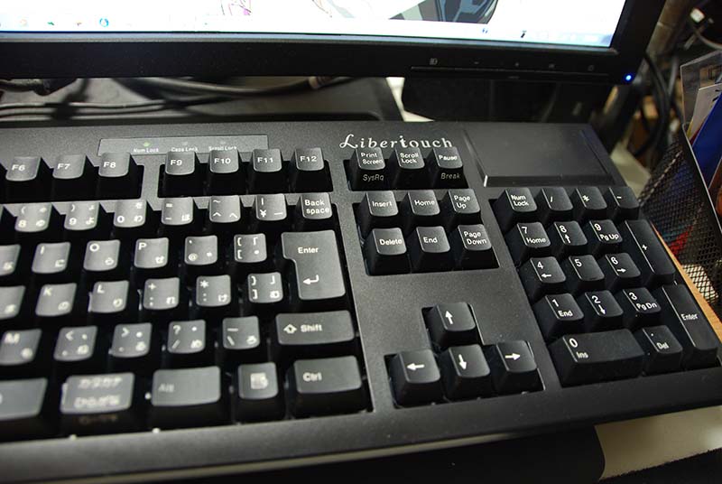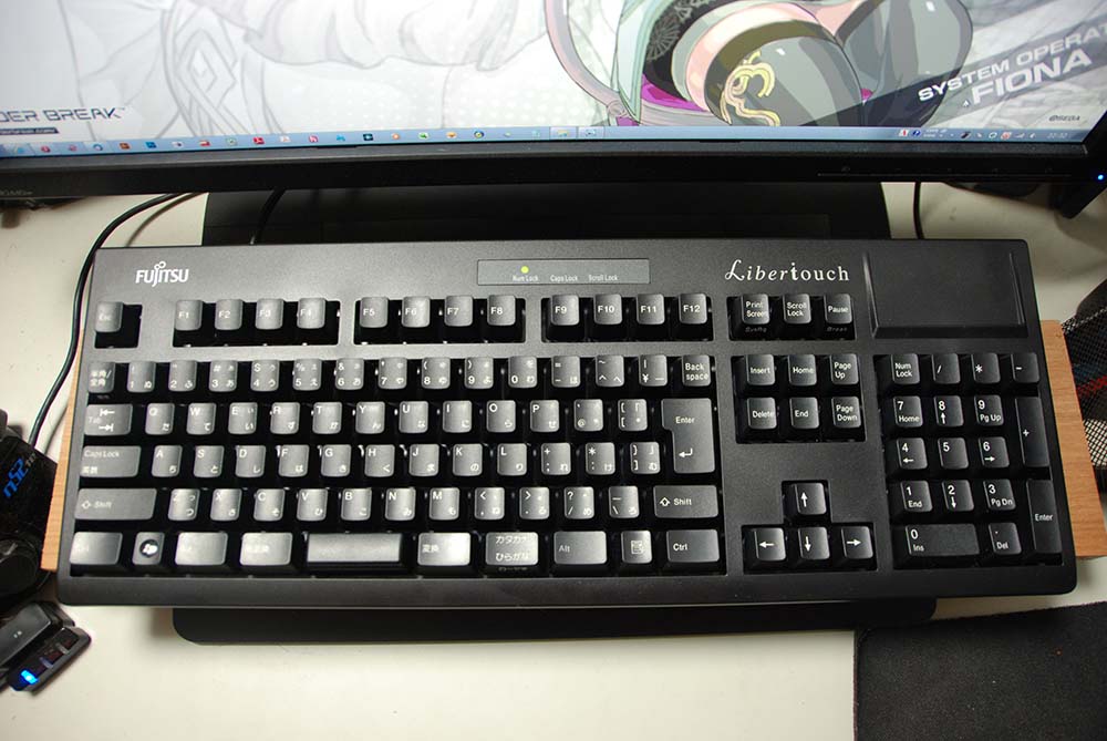 とりあえず色々疲れを感じる日々だったので、自分にご褒美とそれなりに高いPCキーボードを購入してみました。この十年間はずっとエレコムの1980円キーボードを使ってたので、自分にとっては大革命だったりします。 富士通コンポーネント デスクトップPC用キーボード ■FKB8540 (リベルタッチ) [日本語108キー] 購入価格:¥12,800(ポイントバックあり) 一万円以上するキーボードですと 東プレ Realforce PFU Happy Hacking Keyboard などが思いつきますが、[予算の問題]と[人と違った物が使いたい]という二点より富士通のキーボードのしてみましたw キータッチ自体は別の機種で確認し(同じ荷重45gのもの)、キータッチの感触と音には好印象。これならいけるかなと通販でぽちった次第です。 で、まず見た目ですが 見た目は普通のキーボードです。 キートップの印字もレーザーですし、東プレやPFUの様な墨色による高級感などありません。 逆にNumLockなどのLEDの位置が真ん中で、テンキー上にぽっかりと謎の空間があったり。・・・そういう意味ではかなりアウトローなデザインになってます(苦笑) とにかくこいつが最大の弱点です。こんな一風変わったデザインのため、まず人に勧めることが出来ません(苦笑) なので、こんなルックスで[ちょっと打ちやすいキーボード]止まりだったら「メンブレンなのに何でこんなに高いんだよ此奴」と非難囂々な訳ですが、そのメンブレンが普通のメンブレンではあらずなのです。キー側に大きな特徴あり。 軸自体がしっかりとした作りなんですけど、そこにキー側にスプリングと荷重調整用のラバーがついています。結果、入りと終わりに絶妙な荷重がかかるのがこのキーボードの特徴だと思います。 これこそこのキーボードの売りだったりです。 しかし、そこを全く強調しない富士通コンポーネント。 「業務用キーボードのノウハウを反映させ、コンシューマ向けに Libertouchシリーズを発表!」と玄人向け商品を出してきたのに、最重要ポイントをカタログ上で全く魅せず「メンブレン式」の1ワードで片づけてしまった当たりがすばらしいです・・・今のHP観てもそうですが、全く売る努力を感じさせません(苦笑) さらに過去の期待はリコール問題もあったようなので、もはや全く売る気が無いシリーズと化してしまってます(涙) 感触はCherry社の茶軸をもう少し軽くした感じですが、キーが落ちる感触は絶妙なのと、音がわりかし大人しめになってくれるところが良いところだったりします。 (ただし鉄板入ってるため強打すると若干「カーン」というプレート音が響いたりです。しかし、メカニカルと比べればかなり静かです。チェリー青軸の様な音の危険さはありません) 保守部品で交換ラバーがついてるので、荷重を35gか55gに変更することも可能です。 スプリングも付属してるので長く使える安心感あり・・・なのですが、他の方もおっしゃってるようにすべての主要キーが変更できないラバー数なのと、45gの荷重ラバーは一つもないし別売りもされてないところが詰めの甘いところだったりします・・・そこあれば安心感は最高だったのに、どうして抜けているんだろうかと(汗) その他キーの特徴。 キートップの幅がわずかに小さいと思います。12mmジャストです。 キーピッチは同じで、トップはわずかに小さいので個人的には誤打が少なくなるかなーと感じましたが、ここは人それぞれかと。 キーストロークは一般的な深さです。私は東プレのキーストロークは少し深く(長く)感じてたので、その点でリベルタッチの方が好きだったりします。 総評ですが、東プレが1万7千円前後からスタートな高級キーボードな事を考えれば、5千円位安くてこのタッチ感を手に入れられるのは素晴らしい事だと思います。 ただし、キートップの印字はレーザー、色も黒はホントただの黒(東プレは墨色)・・・とルックスの高級感無し・・・なので、タッチだけに本当に1万2千円払うか否かだと思います。 普通に人に勧める場合は間違いなく東プレです! あの感動の感触、墨色の高級感、壊れにくさに昇華印字で文字も消えづらい あれは買うだけの価値があるキーボードだと本当に思います。 ・・・お金があればw 対するリベルタッチは・・・このタッチが好きじゃなきゃ、他は全部不器用に感じるところだらけなんですよね。何せデザインの方が(苦笑) ただし、リベルタッチユーザーの他の方のレビューを観ても感じることは ・このキーボードの感触は独自に素晴らしい物である事! ・この不器用なキーボードを愛せずにはいられない事! の二点である。 とにかく不器用すぎる製品であるから逆に愛着がわいてしまうのが一番の特徴なのかもしれません。自分はもし終息発表されたらもう一台買おうと思ってます。 他のキーボードはそれは素晴らしいですけど・・・このリベルタッチから他のキーボードの乗り換える理由が見つからないっていうのが今の満足感を表してると思います。 ずっと使い続けてたエレコムの19