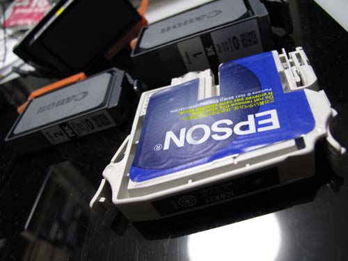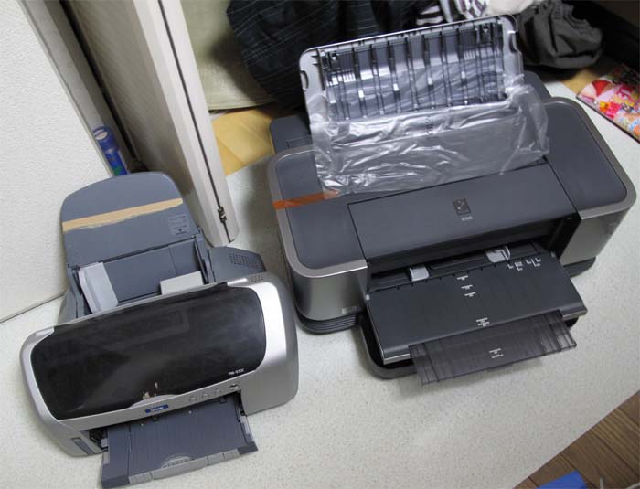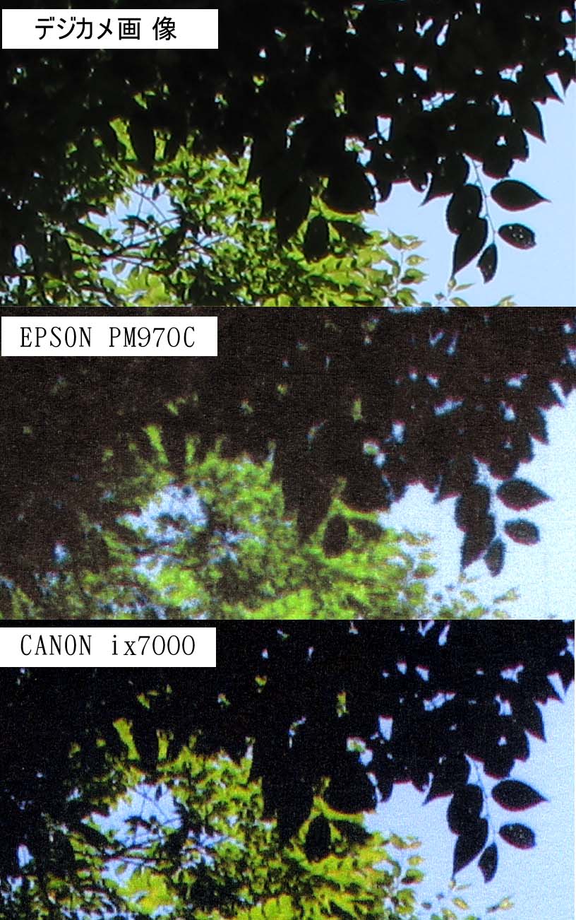 ■EPSON | PM970C■ (A4対応/7色インク/2002年モデル) こいつをずっと使ってきた訳なのですが、 ●給紙ローラーがボロボロ (手で押さえてないと、10枚くらい一気に吸ってしまう) ●インクコストが馬鹿にならない (7色パックで7千円、しかも1タンクはたった10CC) ・・・と言うわけで、もしも次にインク残量警告が出たら もう買い換えてしまう・・・と心に決めていたところ ついにその日がやって参りました!!しかも三色同時に(苦笑) で、買ったのがこいつ↓ ■CANON | ix7000■ (34,800円/三年保証代上乗せで) で、話が長くなるので、先に僕のこの機種の感想を述べときます ●サイズ>やはり大きすぎる 前面給紙トレーと両面印刷ユニットのせいで、他のA3インクジェットより一回り大きい ●印刷の細かさ>満足 黒の色、インクの細かさ滲まなさは素晴らしい ●色の忠実度>くっきりしてるけど忠実度は駄目 三色インクの限界? コントラスト上げて綺麗に見せてる分、部分色をつぶしすぎる。部分色濃すぎる。 (僕はモノクロ漫画しか描かないから気にしないけど) ●印刷スピード>印刷というよりウォームアップが遅い まずウォームアップでインクかき混ぜる動作が入る分遅い。 印刷自体はそんな遅いと感じないけど ・・・クリアインク飛ばしてるせいか?やはり遅い。一人作業用アイテム ってのがざっとした感想。僕は黒がクッキリでる事とそこそこのカラー画質のみ求めてたのでオッケイなんですけど・・・他の方が買うか場合は色々注意が必要だと思います。 で、ネットの実際買った人の情報が少なすぎるので、 もしix7000を調べるためにこのサイトにたどり着いたのならば?・・・と少しでも判断材料を記載しておきます。 =========================================== まず僕が今回プリンターを買う上でつけた条件は・・・ ●買うならば漫画原稿制作で大いに役立つA3プリンターを ●黒は絶対綺麗なものを、細部が細かく印字できるモノ ●良いデジカメ買ってしまったのでそこそこカラー印刷できるものを ●でもインク代は出来る限り安く済ませたい ●メンテナンスがある程度こなせるモノを ●通常に修理が出来る物を ということで、まずレーザー買おうかとも思ったのですけど、 最終的にはこのix7000にしました。 ●サイズ 最初からデカイのは承知の上だったのですが・・・ ・・・・・・改めてデカすぎるな、こいつ・・・ 前面に給紙トレー有り 両面印刷ユニット ・・・って事で、他のA3プリンターよりも一回り大きかったりします 因みに重さは約20Kgです(苦笑) ●インクタンク 青いラベルが貼ってあるのが今まで「このぼったくりインクが!!」と常々思ってたインクです。 ・・・対比してみますと ・・・・・・あれ ・・・・・・・・・まじかよ、CANON (涙) 一番でっかいのは用紙をコートするために使うクリアインクで これ見た瞬間は「おっすごいじゃん、最近良心的になってるの?プリンタ業界」 と思いましたが、 通常インクのサイズにはびっくりした。 ・・・これ、サイズ的に10CC軽く切るだろ(TT) まあ、実際使い切るのに数ヶ月かかるはずなので、今の印象はこの程度しか言えません ●画質 いちお、自分なりに比べてみたので、これで比較して頂くと幸いです。 ただしPM970Cの方は「七年間使い続けてたプリンタ」「インク残量が3つ警告出てる中で印刷」ということを念頭に置いてください。 ・用紙:CANON 普通紙・ホワイト ・画像:Powershot G10 ・スキャン:EPSON ES-6000H(24bitカラー:600dpi) 1)Powershot G10 のオリジナル画像 2)EPSON PM970C印刷物 3)CANON ix7000の印刷物 4)三つの対比図 まず、普通紙なんで 当時まだ「顔料インク」なんて発売されてなかった時代のPM970Cと比べると、 圧倒的にクッキリ印刷されてる!! これはホント細かい部分まで出てるので、漫画原稿打ち出す際も大丈夫だなぁ・・・と安心しました。 しかし、色が・・・潰れます。 カラー6色のPM970C 対してカラー3色のix7000 陰の部分をみてると分かりやすいんですが、ix7000は思いっきりコントラスト強調した感じで、陰部分がかなりの比率で「ベタ塗り」になってます。 あと、柱の部分とかでわかるのですが ・・・色が全然忠実じゃない。 僕はカラー全然描かない人間だし、写真も資料か観賞用にしか打ち出さないので 色の忠実さとかは気にしない人間です。 だからコントラストが強い>見た目綺麗に見える。 は基本的にOKです。 ・・・ですが、 グラフィッカー&写真家には向かないですね、これは。 元々「ビジネスA3プリンタ」とうたってる商品ですが、 ホントその通りだと思います。 黒の強さとそこそこのカラーを求める人だけにお勧め。 因みに印刷スピードは速くない上に ウォームアップ超遅いです、起動する度にインクタンクかき混ぜるんだよこれ・・・綺麗に出すためにひつようかもしれないけど、そんな凄いインクかよこいつら(苦笑) 僕みたいな一人作業の作業場 もしくは文書や簡単な図だけ印刷する一事務所ならばOK でも設計事務所ならばまずNG・・・そういう所でしたらPX1001買