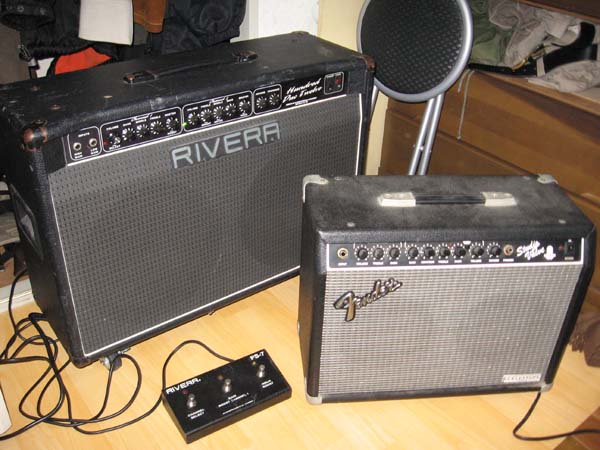 遂にうちに真空管ギターアンプがやってきた!! 左が新しく届いたRIVERAのR100-212で、 右が今まで使ってたFender Japan のSV20CE ・・・ ・・・・・・ まるで「我が家にセリエAがやってきた!」的にでかいっす。 …ってか無駄にでかすぎる。 これ、バンド活動したとき無い男が持つアンプか?(汗) 取りあえず家族には「もう前のアンプ十年使ったから買い換え時期だった」 という苦しい言い訳をした上に、 「ボロボロだから安かった」と金のかかってないところをアピール。 買い換えたアンプがさらにボロボロって…ホント矛盾した言い訳ですが(苦笑) 改めて R100-212 Output tubes: Four EL-34