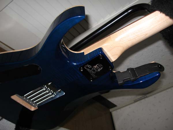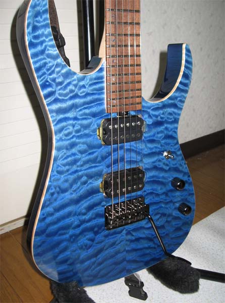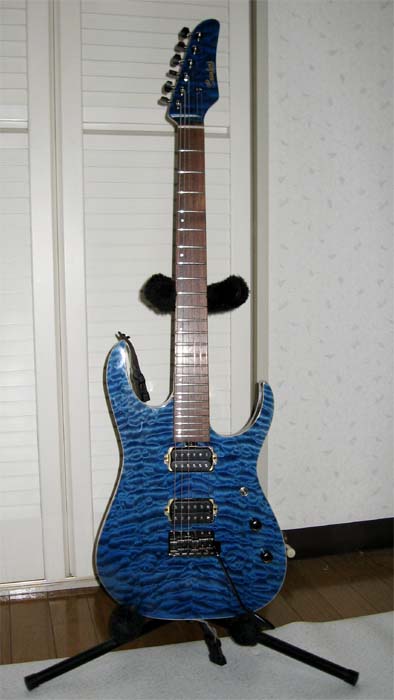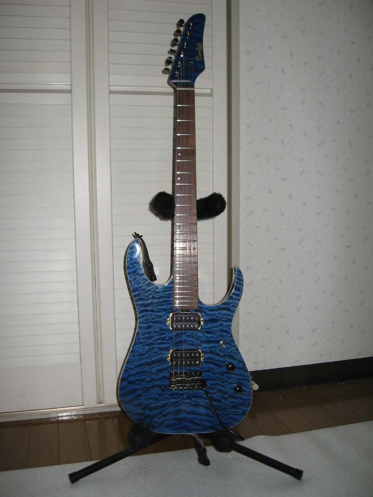 machine Head 後藤 510シリーズ body Top : キルト・メイプル 2P Back : ソフト・メイプル 2P neck ハードメイプル1P ノーマルスケール figerboard ハカランダ(ブラジリアン・ローズウッド) flet ダンロップ 24F Bridge 後藤 六点止めシンクロナイズドトレモロ (with カラハムブロック) Pick uo Front ディマジオ Air Norton Rear ディマジオ Air Norton control ボリューム1 トーン1 3-Way トグルスイッチ 詳細書いてある仕様書は部屋のどっかに埋もれてて見つかりません(^^; ネックは、持ってるIBANEZのJPM100P2(旧ペトルーシモデル:ピカソ3)のネックをコピーしてもらいました。 ヘッドデザインはコンバットギター社長本田さんのギターをまねてます。「社長のと一緒でいいです、アイディア思いつかないんで」 ・・・何しろ、オーダーするって急遽決まって、5日くらいでオーダーすることになってたので、超突貫的にデザインした次第ですから。でも、僕にとってはボティー若干コンパクトなのが大人気があって気に入ってます。 フィンガーボードも実は超値の張るブラジリアンローズウッド・・・ワシントン条約にひっかかる木材なので、かなりの稀少材。でも同じローズウッドでもさらに暖かみある感じなんですよねぇ。ブラジリアンローズは。 コントロール部の位置はピカソ3と一緒。 ピックアップは両方ともエアーノートン。ディマジオのエアーバッカーシリーズで一番クリアなピックアップだから。 リアノートンなんて初めてだけど中・高音かなりいいかんじですよ。トリブリーになる直前で止めた落ち着いた音で僕は好きです。 で、ブリッジはストラト系で使われるシンクロナイズドトレモロ。トレモロほとんど使わないんだけど、スプリングによる残響音がほしいのでこれです。六点止めなのは社長さんに「六点じゃないとカラハムつかない」って言われたからです。僕は二点希望でした。ジェフベックみたいなやつ。でも六点の方が理論的にも音いいですよね。 ■背面。 ・・・これが今回のサウンド面目玉となる バック材にソフトメイプル!! 市販品でソフトメイプルをバック材で採用することはほとんどありません 理由は・・・高い材だけどフラットすぎて特徴ないから、率先して使われることがまずないんですよね。 しかもソフトメイプルは木目がでるから通常TOP材5ミリの化粧板なんですよ・・・40ミリっていったら化粧板8本分つくれますもんね(汗) でもやっぱり音質的に上品だけど「上品だねー」で終わりそうな木材だからだと思います・・・マホガニーとかアッシュとかと違って、楽器屋だと埋もれがちになるかもしれませんね。 かといって音質最高といわれるハードメイプルは・・・重すぎてジョージ=リンチ以外引けそうにないですし(苦笑) で、結果ソフトメイプルバックですが・・・ シオ的にはこれがすばらしい!!! 音質のバランスよくて、なおかつ音に厚みもあって 特に低音の濁りのないところが最高です!! これはコンバットに作ってもらったと言うことと、実は弦が11-52の極太設定ってこともあるかもしれませんが(^^) とにかく今回サウンド面の望みは 「ピカソ3の不満点をすべて改善したギター」 だったので超大満足な仕上がりです。 ちなみに木目の方は、最初「木目ないプレーンでお願いします・・・木目あると値段張るから」と依頼してたのですが、ネック預けにいったとき 社長「いまさぁー良いプレーンのメイプル全然入らないからさあ!!」 となんとフレイムかかってる木材を選ばせていただいた次第。 バックは濃い色だからわかりづらいけどね、・・・誰にも見えないし(笑) でも超高い木材にしてくれて、ちょっと優越感感じちゃいます。 ・・・ブリッジの根本についてる金属ブロック「カラハム」 は実は未だによくわかってない。社長曰く「密度がよくて、音がすばらしくなる(サステイン系)」 とのことで、言われたまま付けた次第です。 結果、音いいっすよー。上品にのびてくれます。 とりあえずどんなギターなの?と聞かれれば 超上品な音を奏でるギターです。 それは、ギブソンやグレッチのエレアコ等を指すのではなく。 音が暴れすぎず、上品にのびてくれるというサウンドです。 メイプルボディーなのでアタックの感度は抜群 かといってアッシュ・アルダーの様な尖り・癖があるわけでもない そこがsioにとっては重要なんですよ。 あとチューニングしやすいことが非常にw ここポイントですよホント。 フロイトローズ系はもう僕的には地獄でスモン。 弦とスプリングの張力をバランスとってユニットを平行にさせる・・・・・・・正直大変なんですよこれって(苦笑) 個人的にはここまでの仕上がりには大満足です。 選択しもぎりぎりの範囲で考えて・・・すべてうまくいったので、最高です。 こっから先の望むスペックとすると 「ボディー材:ハードメイプル」 ・・・音は良いでしょうが、重すぎて持てません(汗) 「フィンガーボードもメイプル」 ・・・そうすればオール・メイプルだけど・・・僕はローズウッ